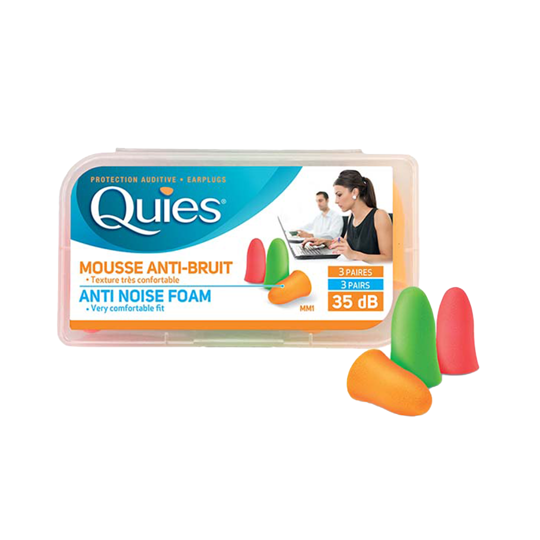 Les mousses anti-bruit Quies permettent d’atténuer les bruits forts de 35 dB en moyenne, sans se couper totalement de son environnement. Leur forme anatomique s’adapte au conduit auditif pour un maintien parfait dans l’oreille. Existe en différents coloris (fluo, chair et disco).
