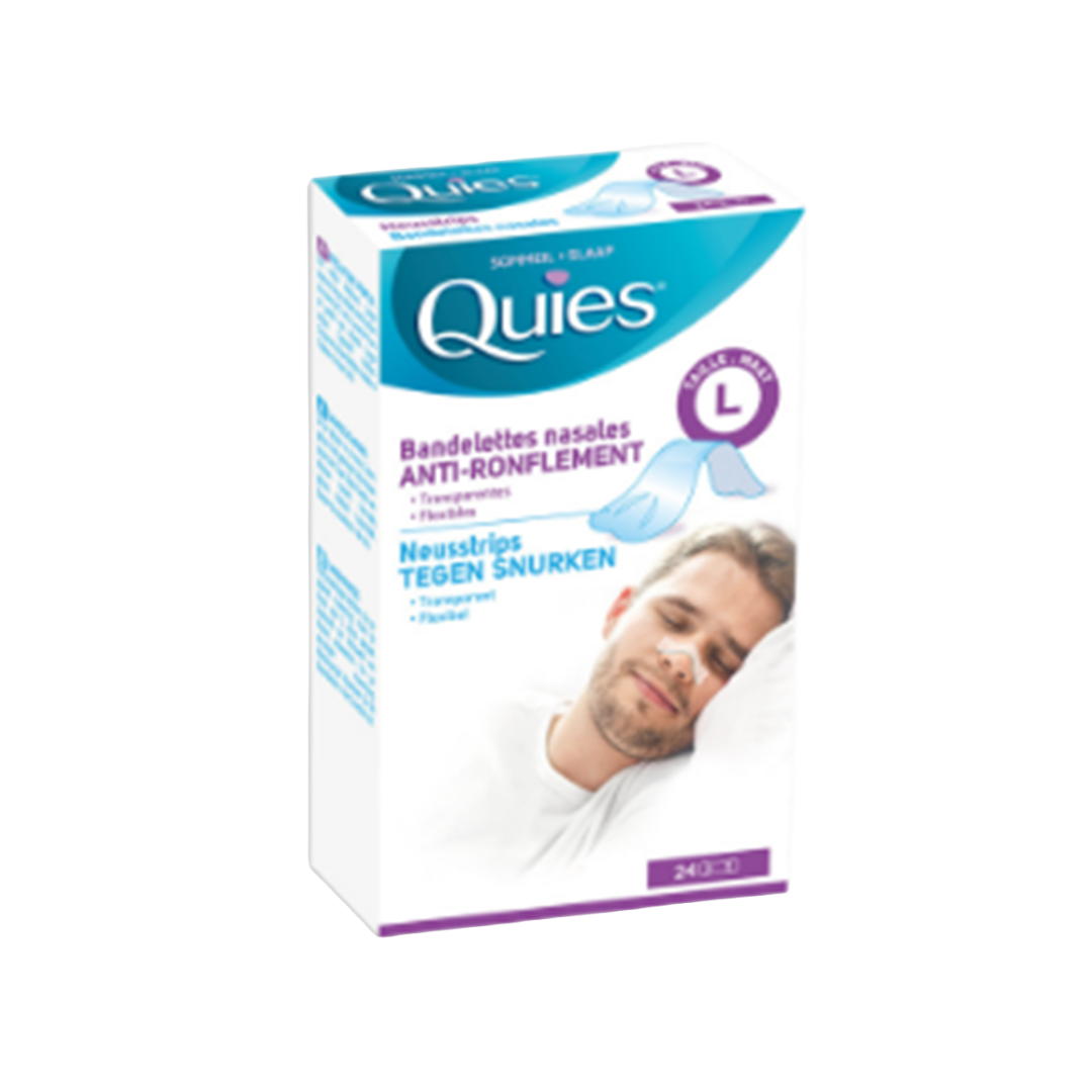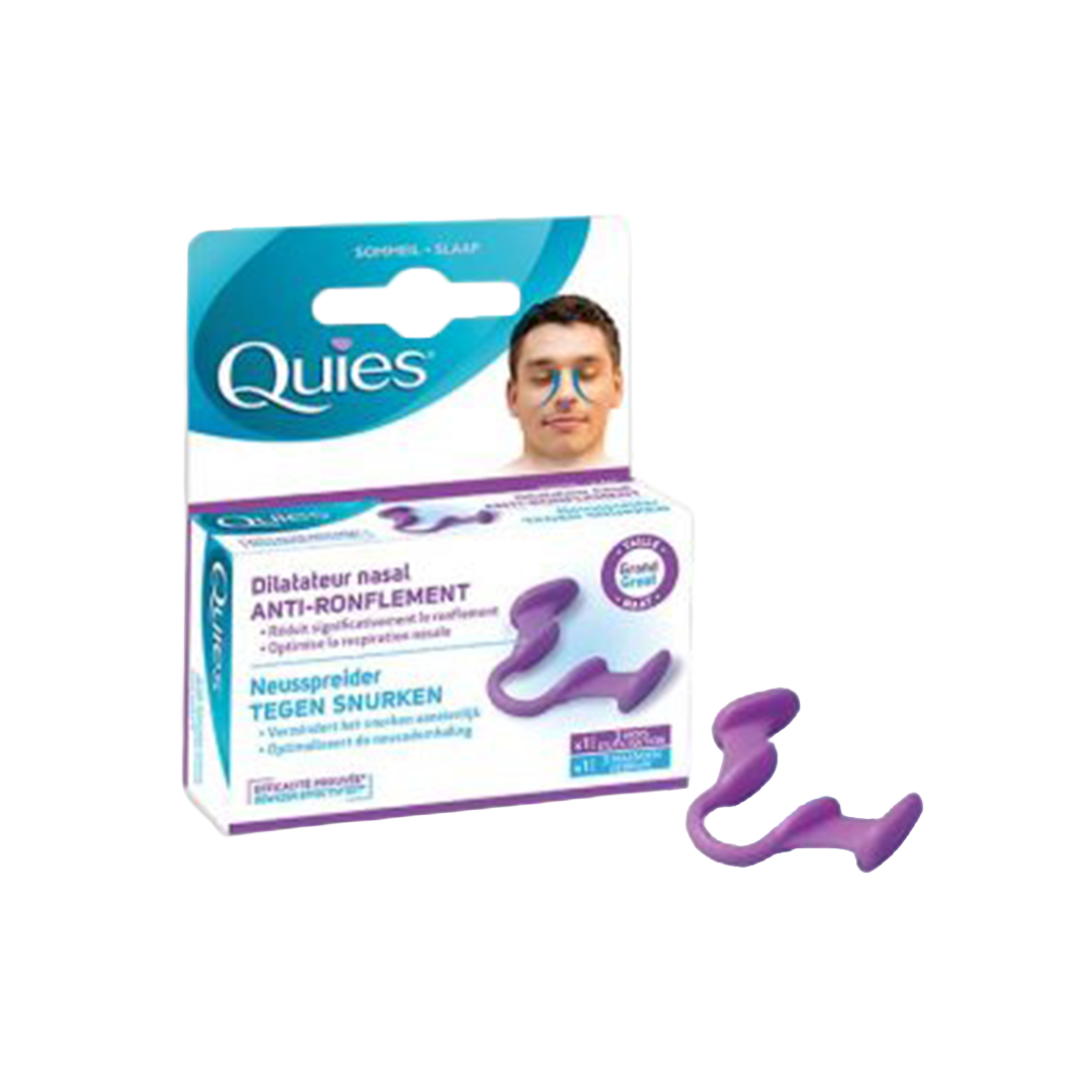 Le dilatateur nasal anti-ronflement Quies (appelé également écarteur nasal ou clip) procure immédiatement une sensation de plus ample respiration, diminuant ainsi le ronflement.