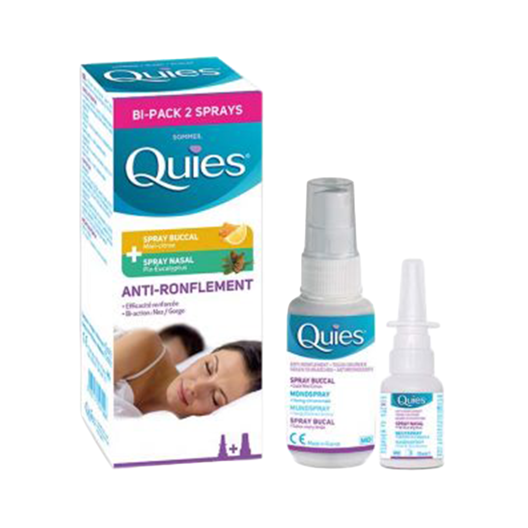 Agit simultanément sur les causes buccales et nasales du ronflement. Le spray buccal Quies permet la diffusion d’un film sur le pourtour du palais, facilitant le passage de l’air et évitant ainsi les vibrations. Le spray nasal Quies permet de lubrifier les voies nasales et de décongestionner les voies respiratoires, améliorant ainsi le passage de l’air et diminuant le ronflement. Ce dispositif médical est un produit de santé réglementé qui porte, au titre de cette réglementation le marquage CE. Lire attentivement la notice. Demandez conseil à votre pharmacien.
