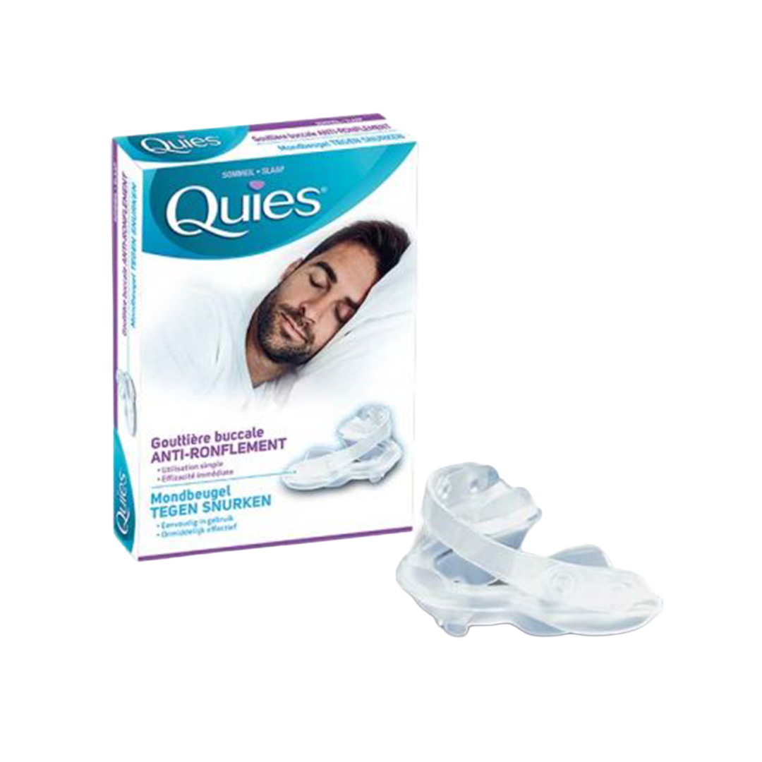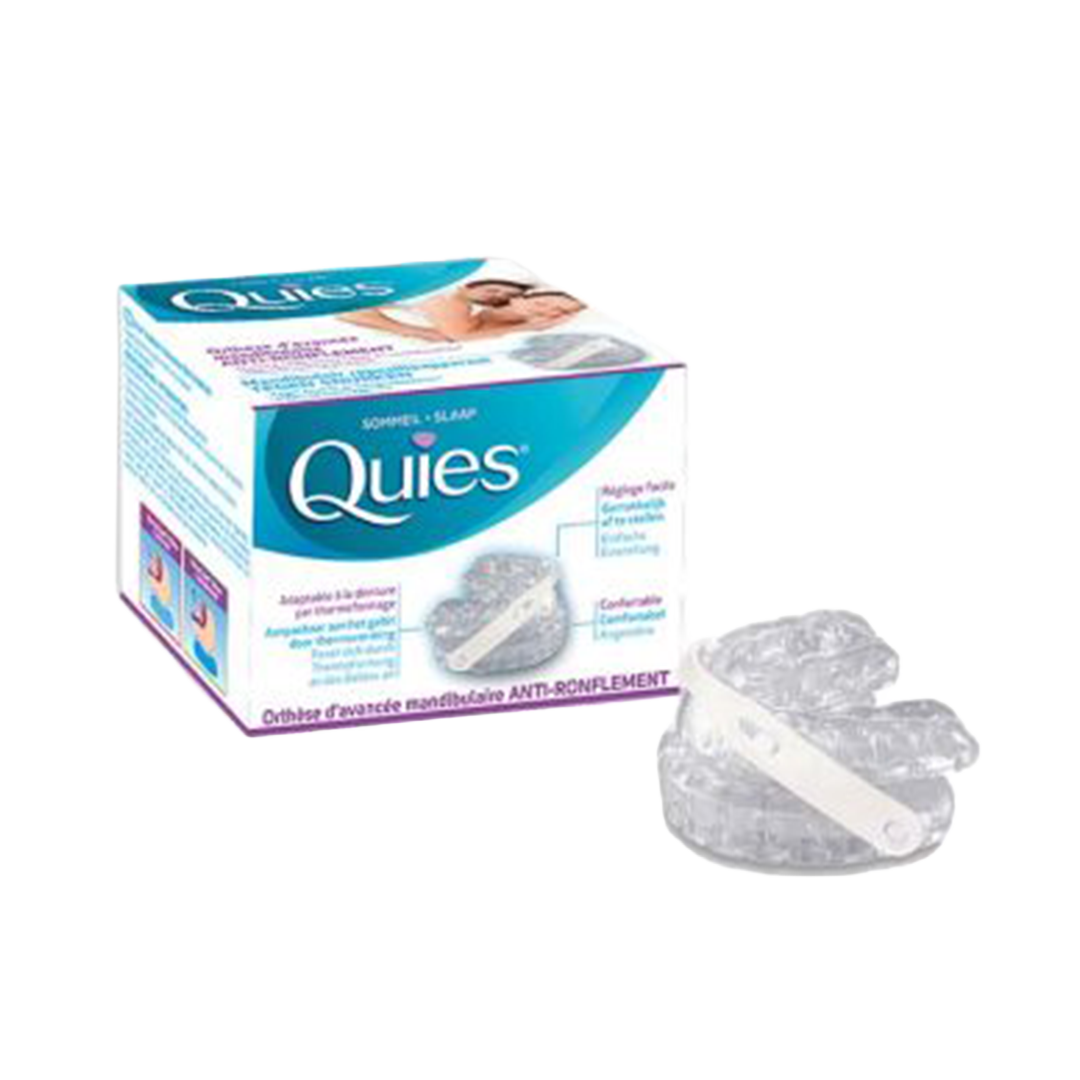 L’orthèse d’avancée mandibulaire Quies permet d’agir sur le ronflement et l’apnée du sommeil modérée en maintenant la mâchoire inférieure en position légèrement avancée (quelques millimètres) afin de favoriser le passage de l’air. Les gouttières dentaires thermoformables de l’orthèse permettent une utilisation à long terme. Ce dispositif médical est un produit de santé réglementé qui porte, au titre de cette réglementation le marquage CE. Lire attentivement la notice. Demandez conseil à votre pharmacien.