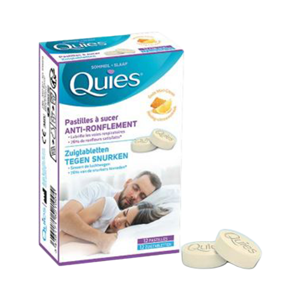 Les pastilles anti-ronflement Quies diminuent efficacement les ronflements grâce à leur action ciblée sur la gorge, principale zone à l’origine du ronflement. La présentation sous forme de pastille à sucer permet une diffusion lente toute la nuit pour une action prolongée. Existe en deux arômes : Agrumes/ Miel-Citron. Ce dispositif médical est un produit de santé réglementé qui porte, au titre de cette réglementation le marquage CE. Lire attentivement la notice. Demandez conseil à votre pharmacien.