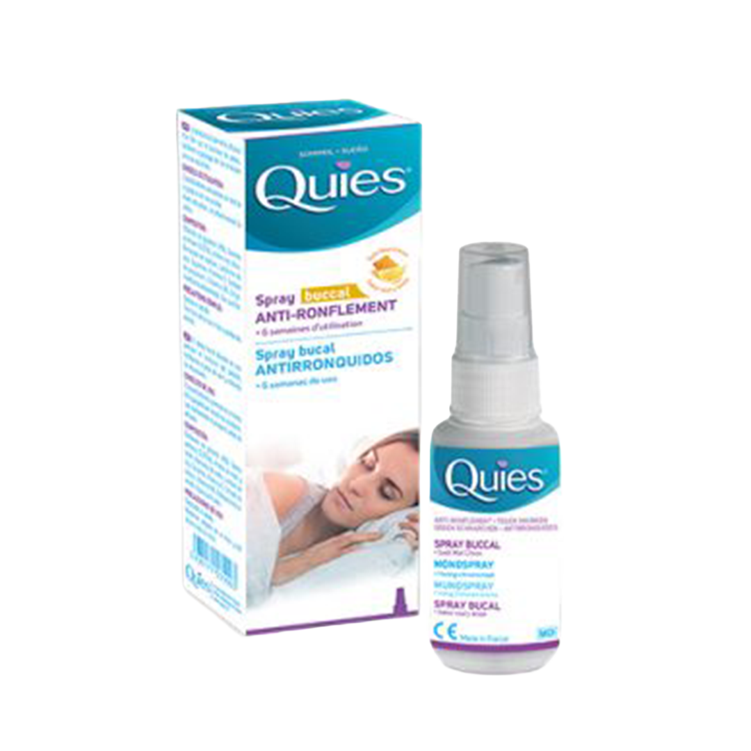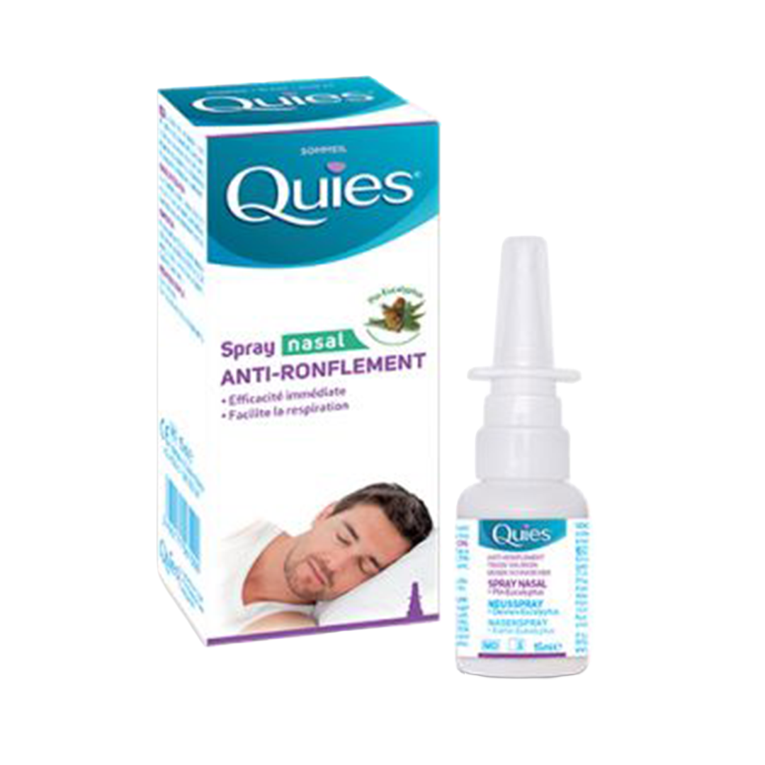 Le spray nasal Quies est formulé à base d’ingrédients spécialement sélectionnés pour lubrifier les voies nasales, décongestionner et dégager les voies respiratoires, améliorant ainsi le passage de l’air et diminuant le ronflement. Ce dispositif médical est un produit de santé réglementé qui porte, au titre de cette réglementation le marquage CE. Lire attentivement la notice. Demandez conseil à votre pharmacien.