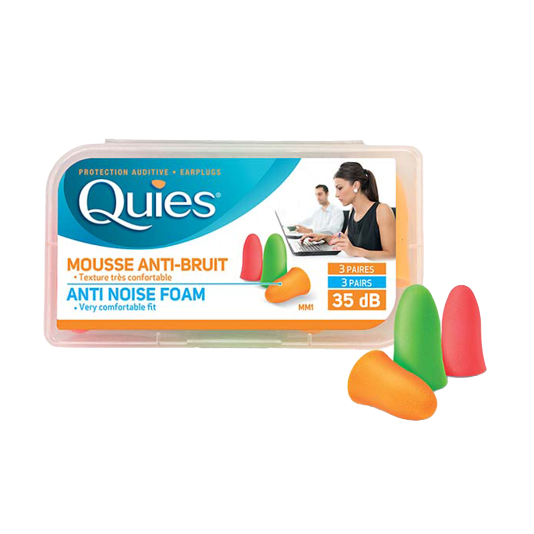 Met de schuimrubberen oordopjes van Quies kunt u harde geluiden met gemiddeld 35 dB verminderen, zonder u volledig af te snijden van uw omgeving. Hun anatomische vorm past zich aan de gehoorgang aan en en ze blijven