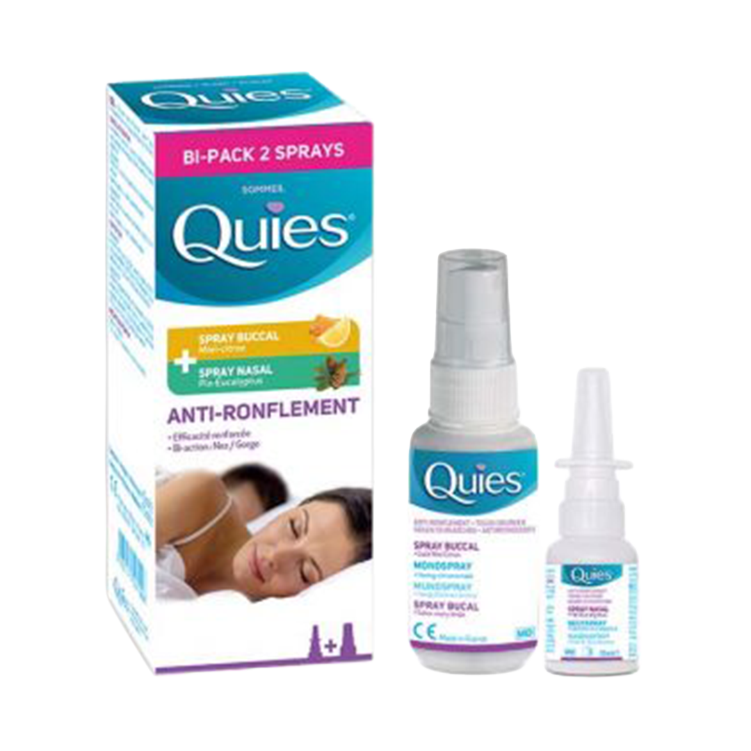Werkt tegelijk op de orale en nasale oorzaken van snurken. De Quies mondspray legt een film aan over het hele gehemelte, zodat de luchtdoorstroming gemakkelijker wordt en trillingen worden voorkomen. De Quies neusspray smeert de neusholtes en maakt de luchtwegen vrij, zodat de luchtdoorstroming verbetert en het snurken vermindert. Deze medische hulpmiddelen zijn gereglementeerde gezondheidsproducten die in het kader van deze verordening van het CE-merkteken zijn voorzien. Lees de instructies zorgvuldig. Vraag uw apotheker om advies.