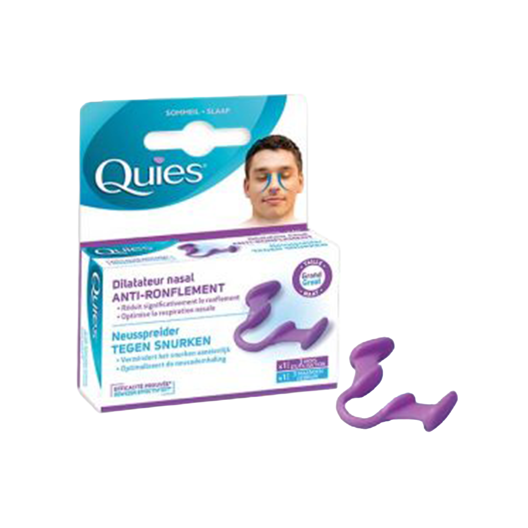 Met de Quies neusverwijder kunnen de neusgaten van de snurker lichtjes verwijd worden zodat de luchtdoorstroming gemakkelijker wordt en de ademhaling door de mond, die vaak samengaat met snurken, wordt vermeden. Eenvoudig te gebruiken, herbruikbaar gedurende 3 maanden. Verkrijgbaar in klein/gemiddeld en groot formaat. Vanaf 12 jaar oud. Deze medische hulpmiddelen zijn gereglementeerde gezondheidsproducten die in het kader van deze verordening van het CE-merkteken zijn voorzien. Lees de instructies zorgvuldig. Vraag uw apotheker om advies.