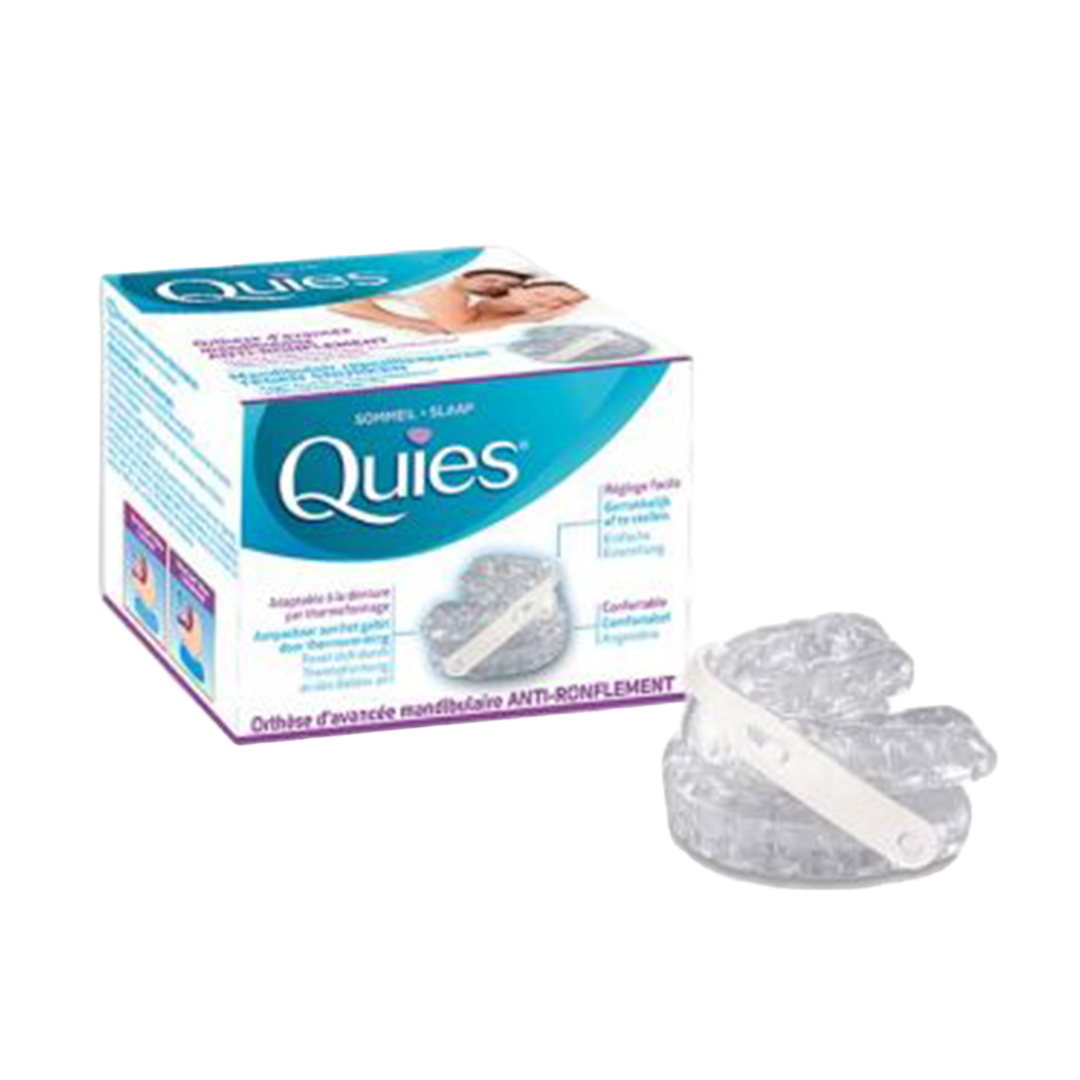 Het mandibulair repositieapparaat van Quies werkt tegen snurken en matige slaapapneu door de onderkaak iets naar voren te trekken (enkele millimeters) om de luchtdoorstroming te bevorderen. De thermovormbare beugels van het apparaat maken langdurig gebruikt mogelijk. Deze medische hulpmiddelen zijn gereglementeerde gezondheidsproducten die in het kader van deze verordening van het CE-merkteken zijn voorzien. Lees de instructies zorgvuldig. Vraag uw apotheker om advies.