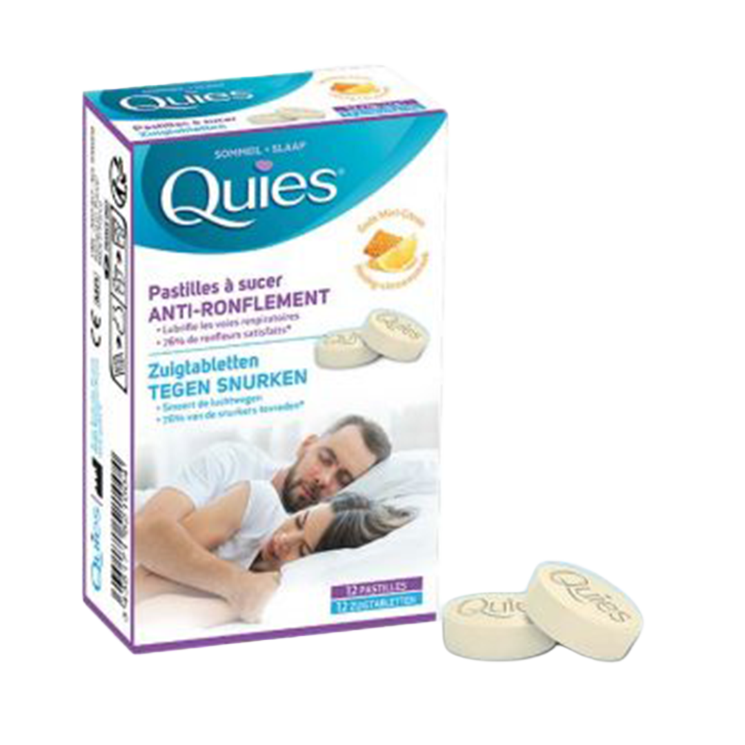 De Quies zuigtabletten tegen snurken verminderen snurken doeltreffend dankzij hun gerichte werking op de keel, de belangrijkste zone die het snurken veroorzaakt. De aanbieding in de vorm van zuigtabletten zorgt voor een langzame verspreiding, de hele nacht, voor een langdurige werking. Verkrijgbaar in twee smaken: citrusvruchten/honing-citroen. Deze medische hulpmiddelen zijn gereglementeerde gezondheidsproducten die in het kader van deze verordening van het CE-merkteken zijn voorzien. Lees de instructies zorgvuldig. Vraag uw apotheker om advies.