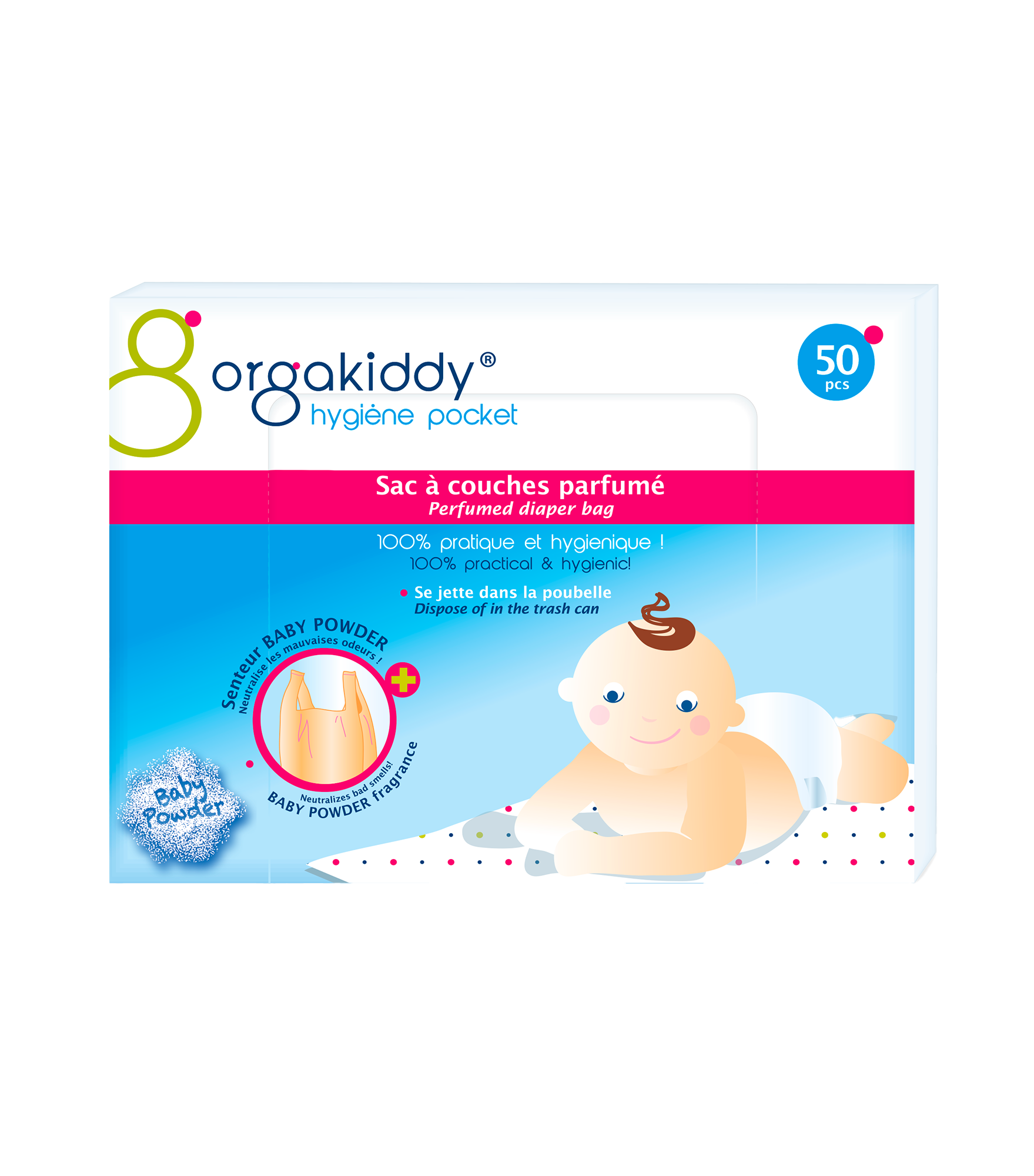 Hygiénique, ce sac délicatement parfumé permet de jeter discrètement et sans mauvaise odeur, les couches usagées, lingettes et autres produits de toilette de bébé.